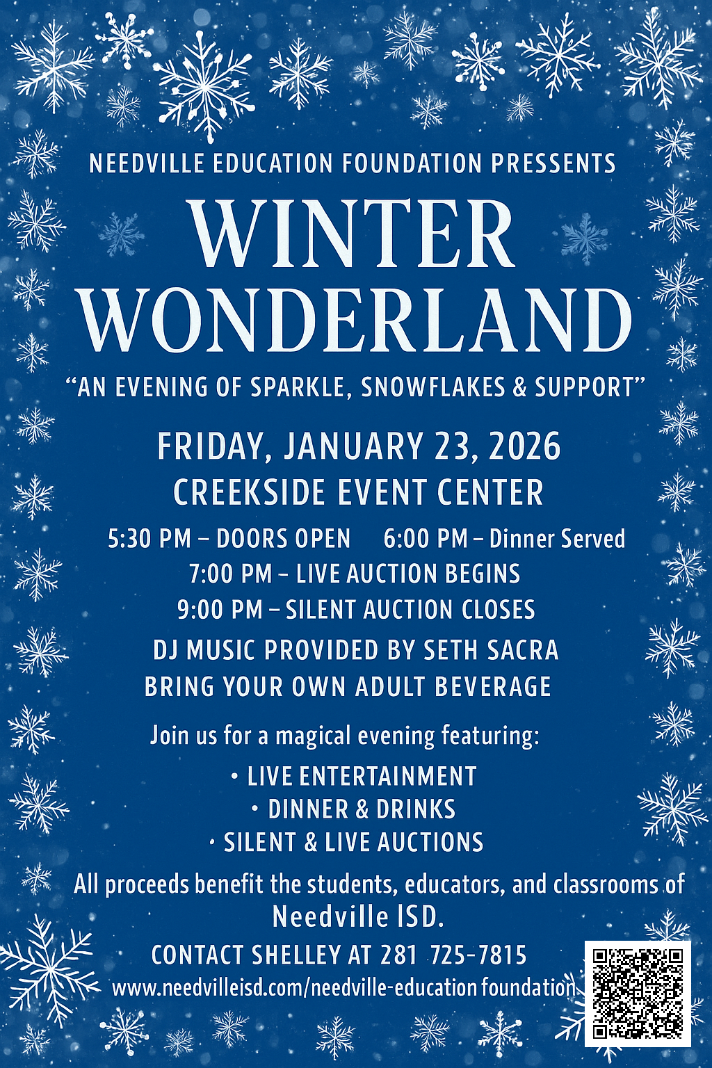 Needville Education Foundation Friday, January 23, 2026 5:30 PM 11:00 PM Creekside Event Center 9531 Seiler Road Richmond, TX, 77469 United States (map) Google Calendar ICS Come support the Needville Education Foundation that benefits local students, educators, and classrooms. Trent Cade will be playing for a short time and will have a special merch basket in the silent auction you won’t want to miss out on!